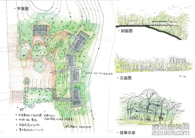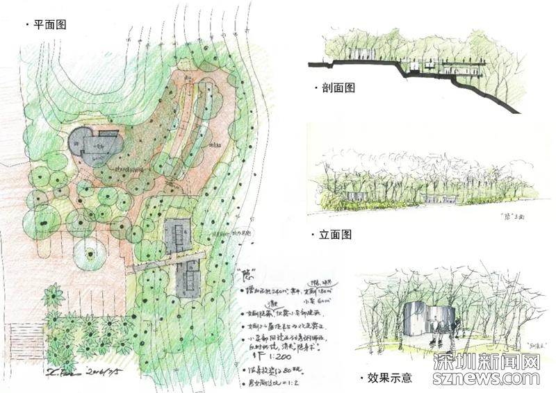 費曉華在文中提到,“隨著深圳人口和游客的劇增,蓮花山頂公共廁所已不堪負(fù)重,急需擴大規(guī)模。2016年,本人受蓮花山公園管理處的邀請,免費為他們提供了改擴建方案。方案共有兩種思路:‘隱擴’和‘顯擴’,均是在保留原建筑的基礎(chǔ)上,擴大使用面積以滿足更多人的需求。從更好地保護自然環(huán)境的角度出發(fā),本人推薦‘隱擴’方案?!?(附設(shè)計圖)