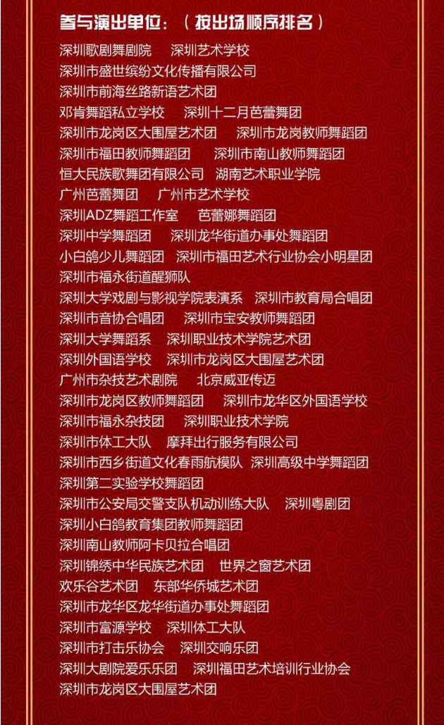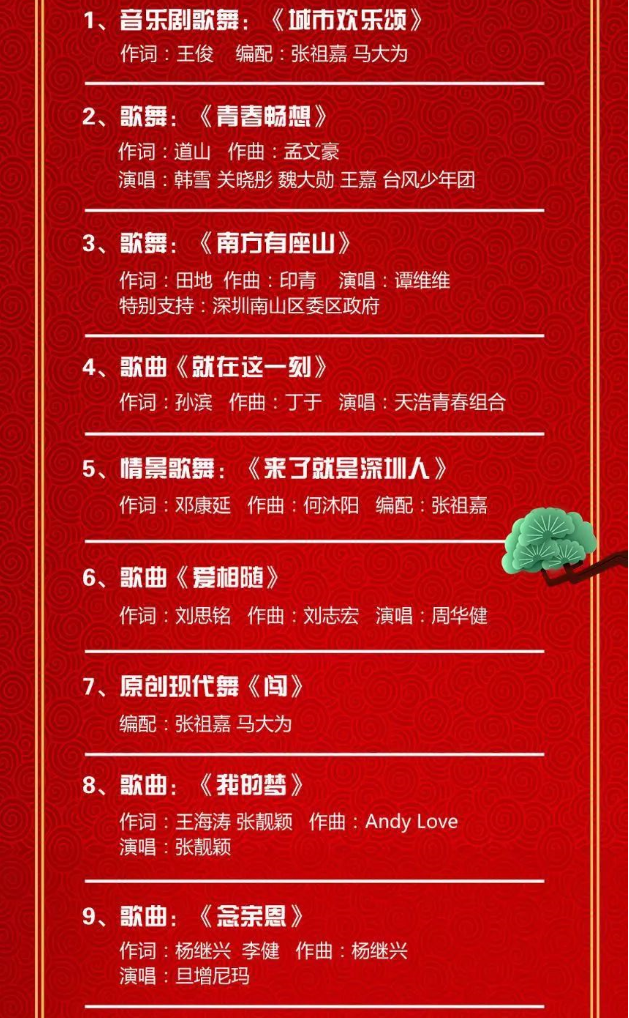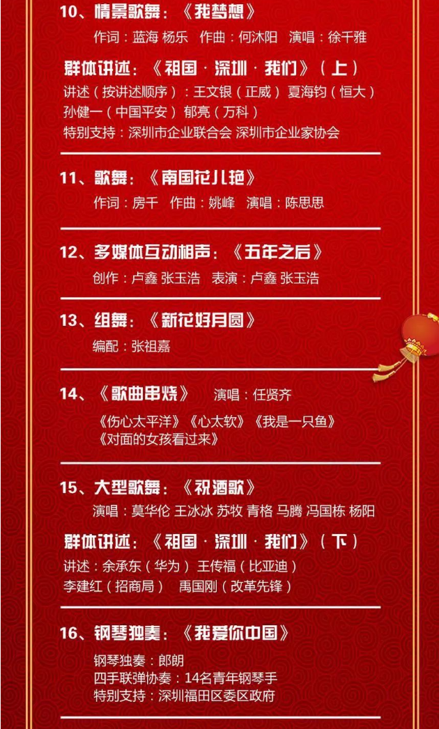 深圳春晚由央視主持人李思思、深圳衛(wèi)視主持人龐瑋、楚喬和香港著名主持人陳啟泰共同主持。晚會(huì)節(jié)目?jī)?nèi)容豐富、表現(xiàn)形式多樣,有歌舞、歌曲、交響樂,還有多媒體互動(dòng)相聲。演員陣容強(qiáng)大,邀請(qǐng)了張靚穎、廖昌永、郎朗、周華健、汪明荃、任賢齊、譚維維等多位明星參演,力爭(zhēng)為全國觀眾送上一道豐盛又精彩的年夜“大餐”。