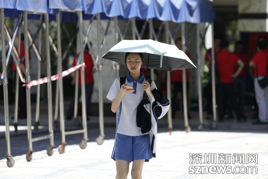 高考語文科目考試結束,一名考生撐著遮陽傘淡定走出考場