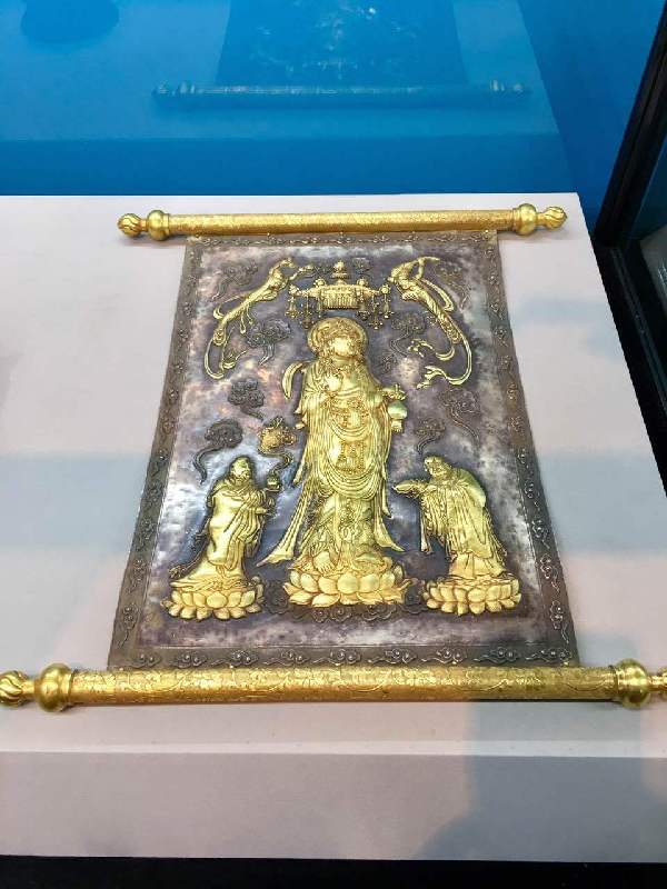 繼上個(gè)月舉辦的第一季“民國(guó)瓷畫展”,目前正在展覽的是第二季“佛像藝術(shù)展”。展出了遼金時(shí)期的銀鎏金佛塔、宋代泥塑描金的書卷觀音像、唐代捶揲銀鎏金“佛說金色王經(jīng)”上下卷,還有南北朝時(shí)期的石雕彩漆描金思維菩薩像,這一期展出了29件展品。